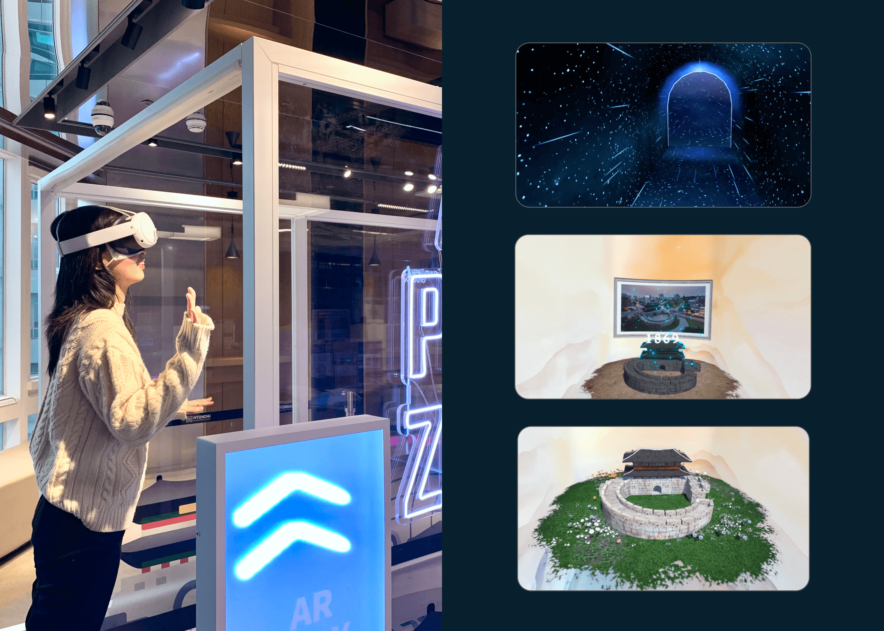 동대문 일대 상권 활성화를 목표로 국내외 관광객 대상 AR·XR 콘텐츠를 제작했습니다. 인근 주요 관광지에서 AR·XR 도슨트 투어 체험을 제공하는 'AR 스탬프 랠리', 매장 간판 로고를 스캔하면 즉시 사용 가능한 할인 쿠폰을 제공하는 ‘AR 브랜드 캐처' 등의 AR·XR 콘텐츠를 현대백화점면세점 앱에 추가했습니다. 또한, 현대백화점면세점의 유휴공간을 활용한 XR 체험 부스를 운영했습니다.