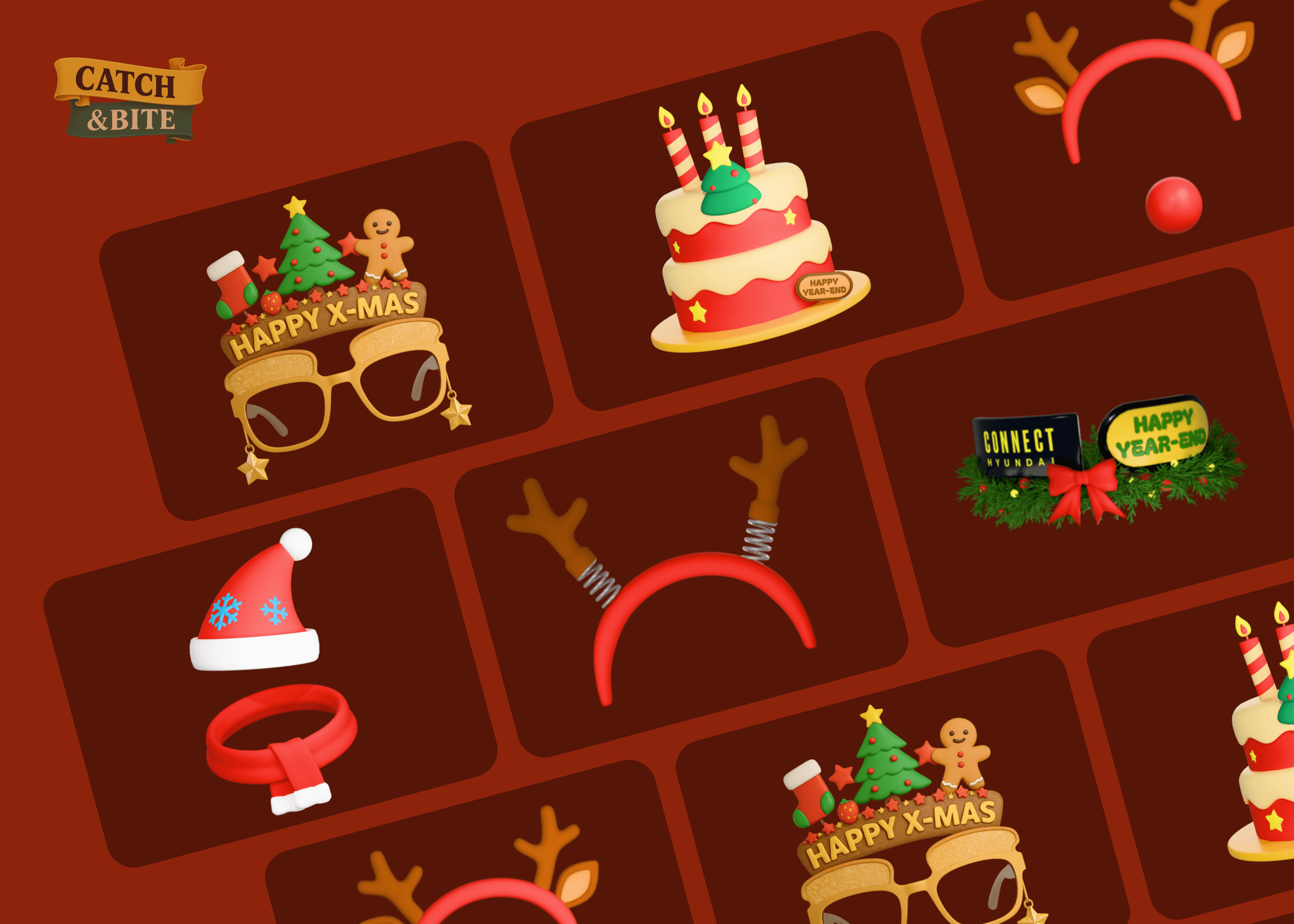 ‘Catch & Bite’는 커넥트현대 청주 오픈 100일과 연말 시즌을 기념해 운영된 웹 기반 게임 콘텐츠입니다. 간단한 방식으로 누구나 쉽게 참여할 수 있도록 구성했으며, 100일 축하와 크리스마스 시즌에 맞는 3D 아이템을 제작해 분위기를 더했습니다. 얼굴 인식을 통해 아이템이 자연스럽게 착용되는 연출로, 시즌에 맞는 색다른 체험을 제공했습니다.