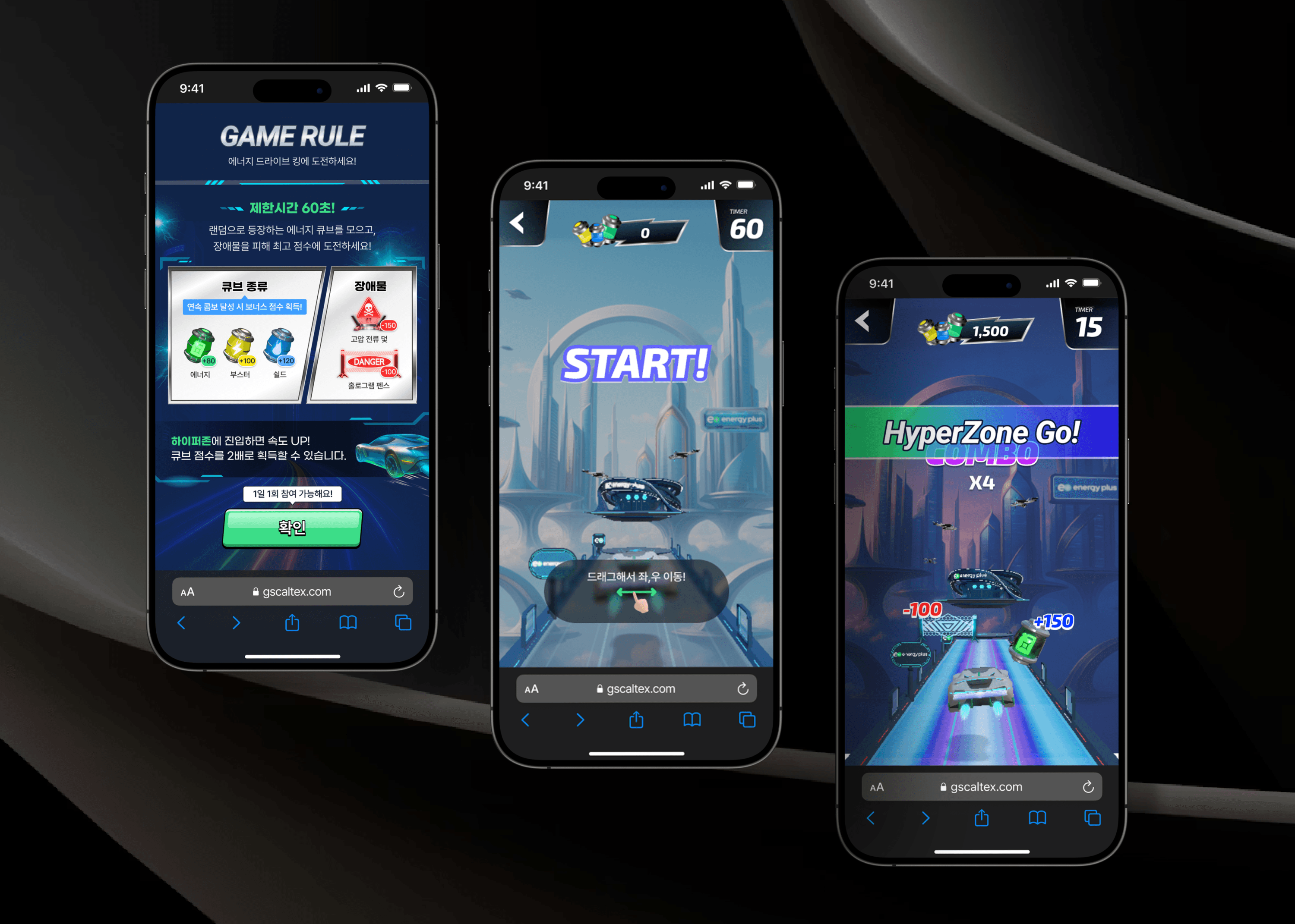 GS 드라이브킹은 1인칭 시점으로 자동차를 조종해 도로를 달리는 레이싱 게임입니다. 미래적인 도시 배경 속에서 주행하며 에너지 아이템을 획득하는 방식으로 전개되며, 주행씬 연출과 아이템 획득 효과를 통해 몰입감을 높였으며, 단순한 조작으로 달리는 재미와 수집의 즐거움을 동시에 느낄 수 있도록 구성했습니다. GS 에너지플러스의 브랜드 이미지를 게임의 세계관 속에 자연스럽게 담아낸 콘텐츠입니다.