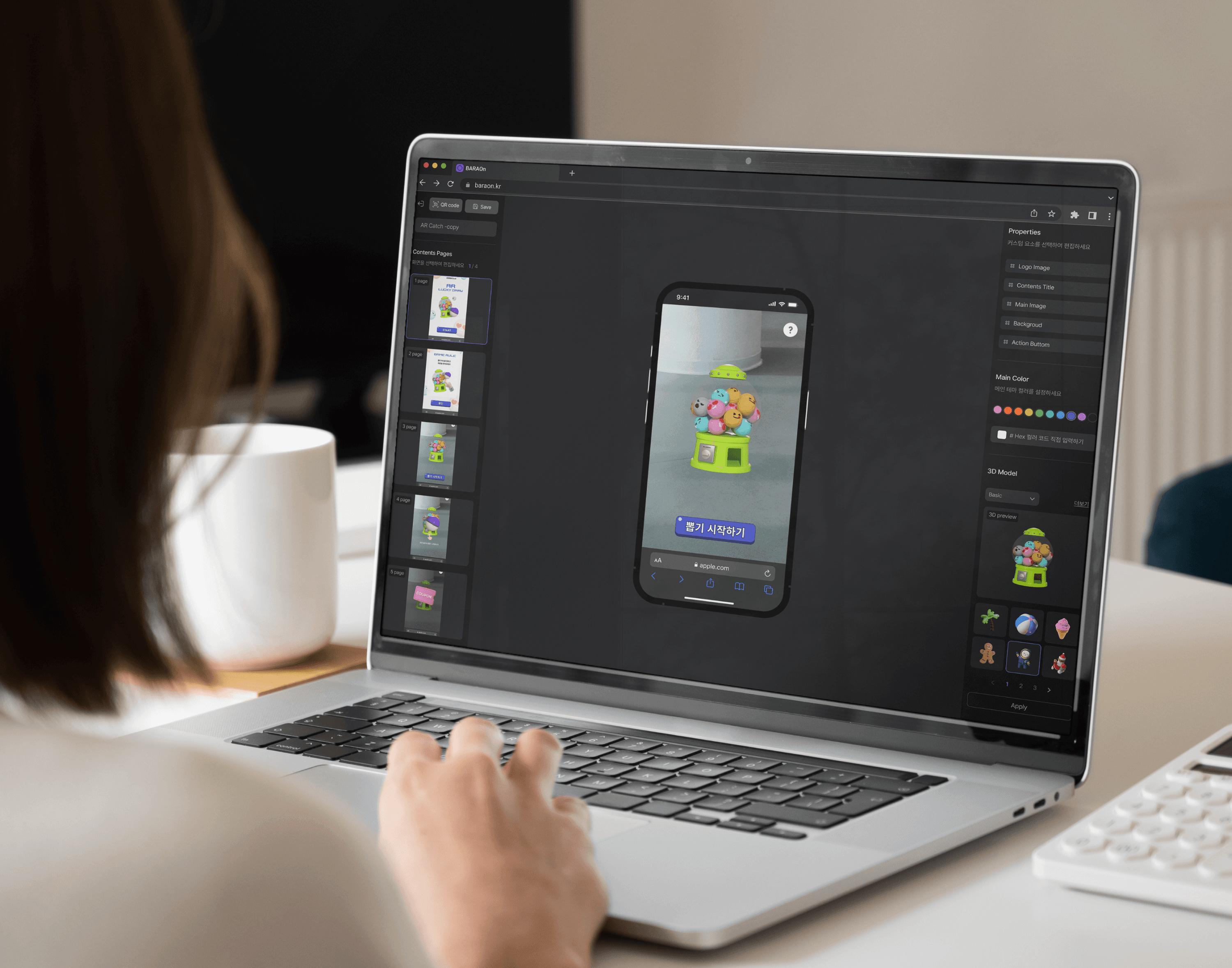 BARAOn은 AR 콘텐츠 제작 경험이 없는 사용자도 쉽고 빠르게 WebAR 콘텐츠를 만들 수 있도록 설계된 웹 기반 AR 콘텐츠 빌더입니다. 복잡한 개발 과정 없이 템플릿과 3D 리소스를 활용해, 프로모션·이벤트·브랜드 캠페인에 바로 적용 가능한 웹 AR 콘텐츠를 제작할 수 있습니다. BARAOn은 웹 AR 콘텐츠 제작의 진입 장벽을 낮추고, 보다 유연하게 디지털 경험을 확장할 수 있도록 돕는 솔루션입니다.