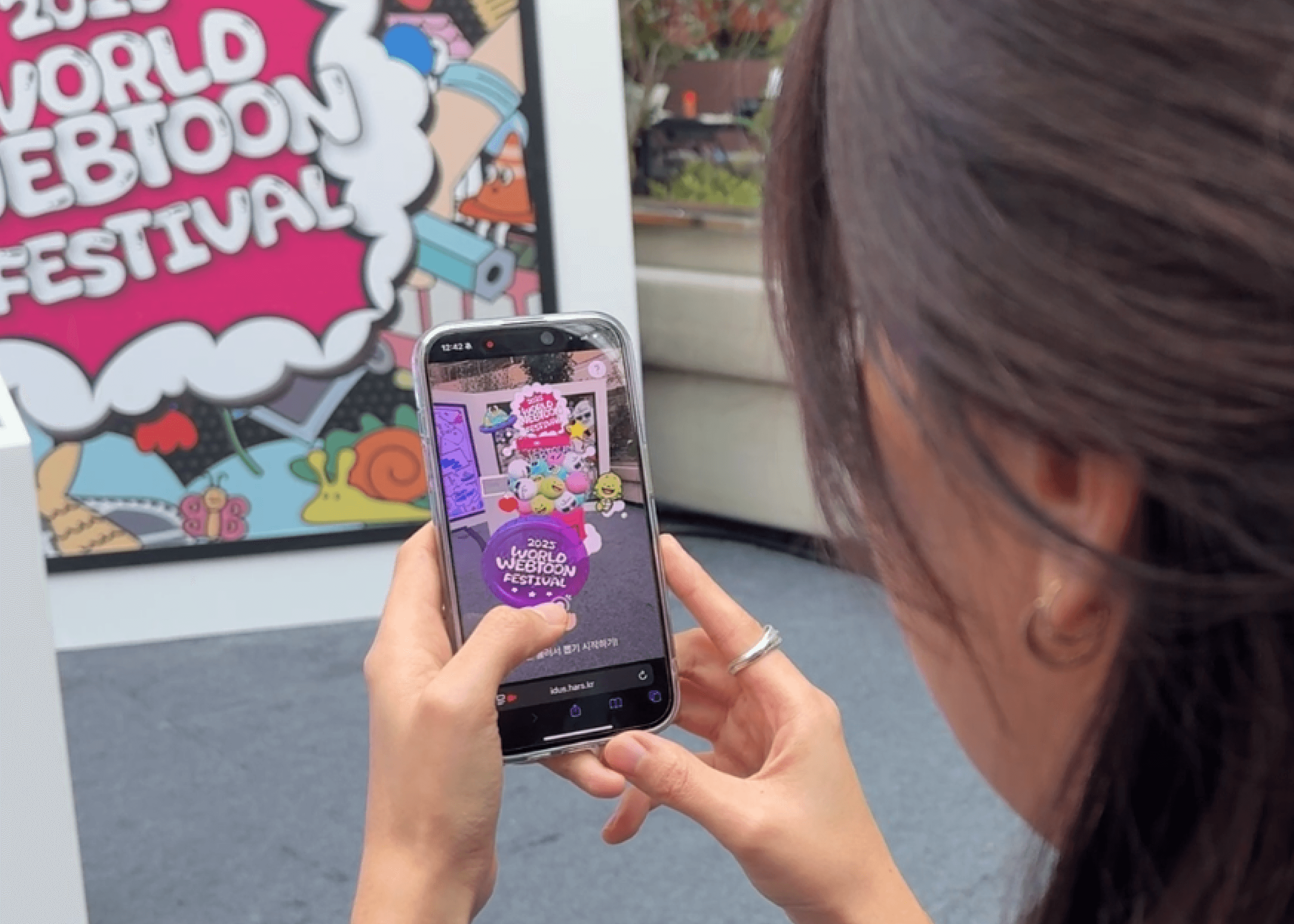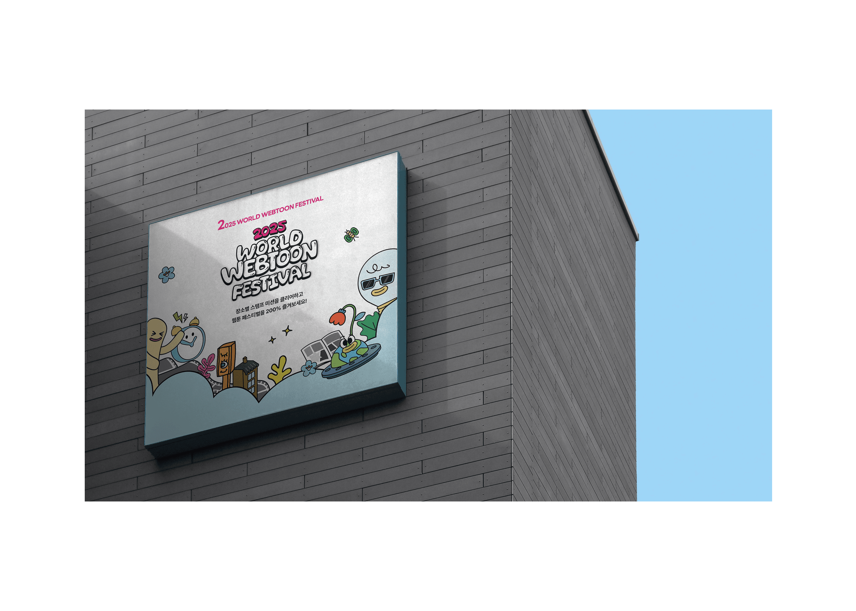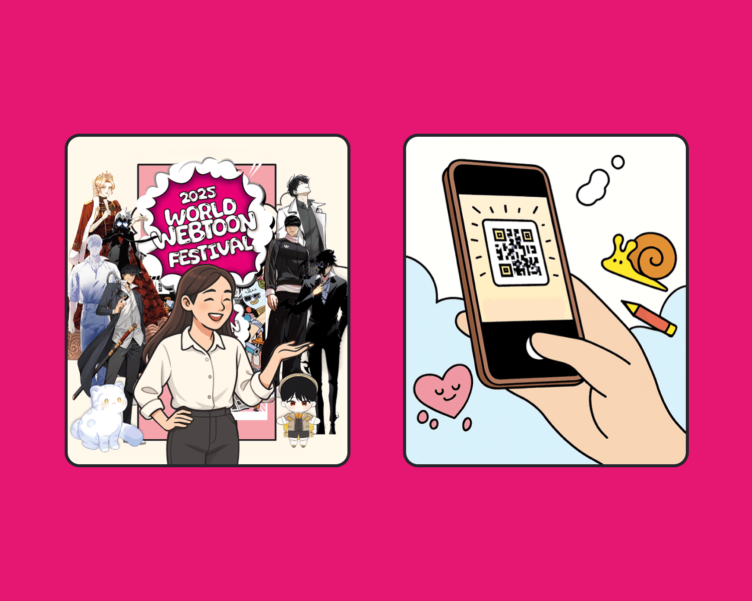 2025 월드 웹툰 페스티벌에서는 각 층 팝업 공간에 배치된 QR을 통해 체크인하며 자연스럽게 축제 공간을 탐험하도록 구성했고, 웹툰 IP를 활용한 포토 콘텐츠로 현장 경험의 즐거움을 더했습니다. 단순 관람에 그치지 않고, 공간을 이동하며 참여와 기록이 이어지는 UX 설계를 통해 페스티벌 전반의 몰입도를 높였습니다.