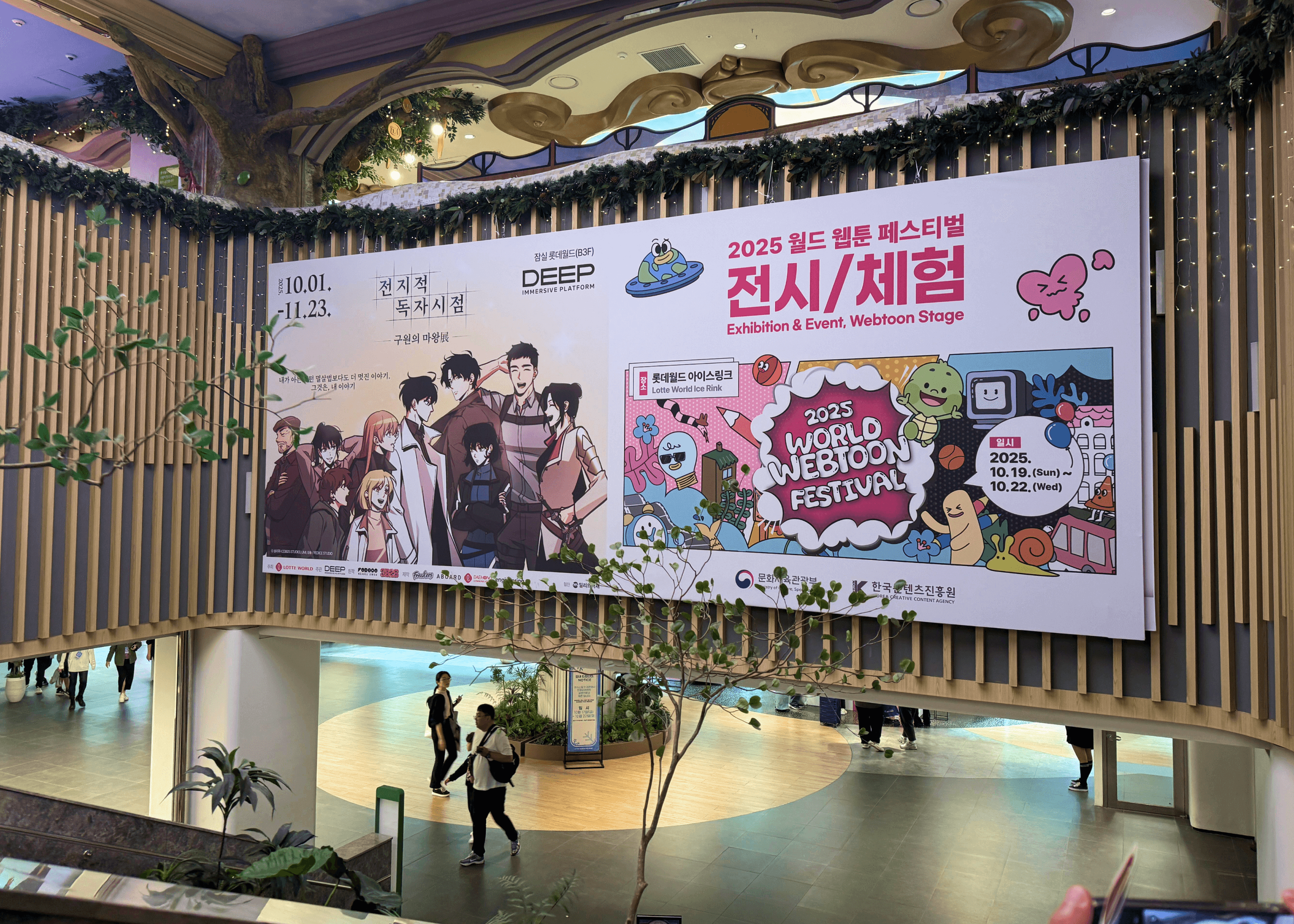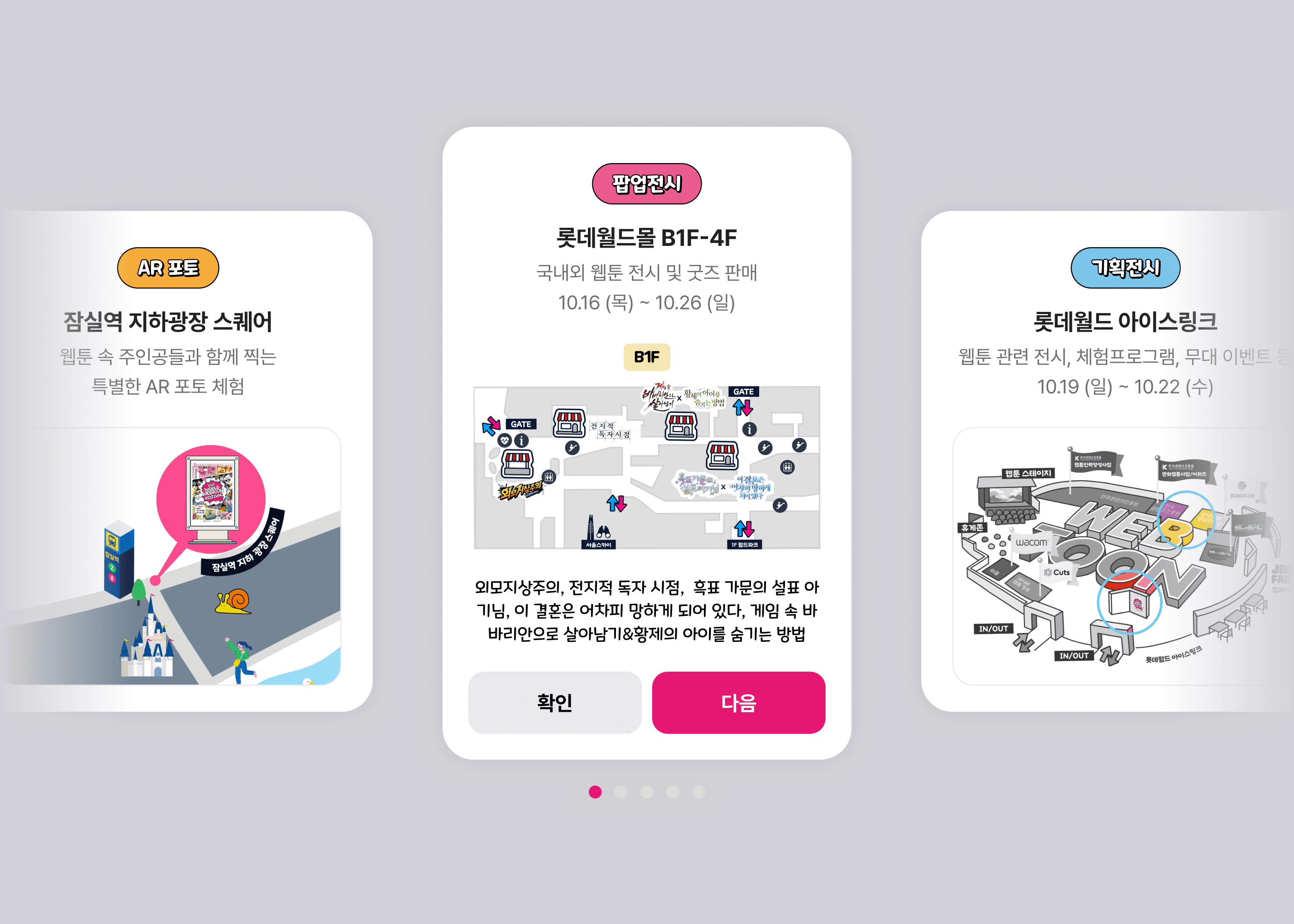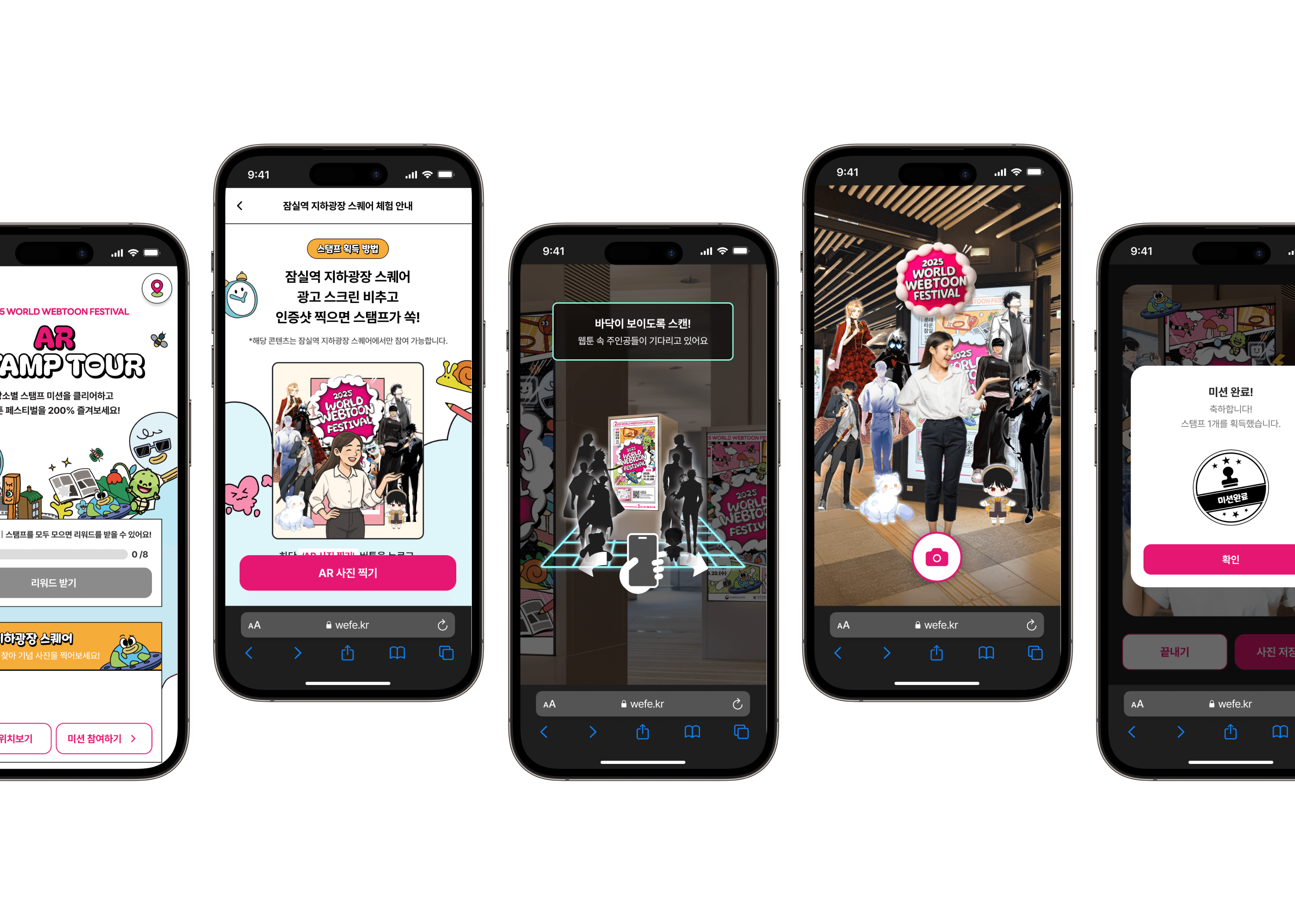 2025 월드 웹툰 페스티벌에서는 각 층 팝업 공간에 배치된 QR을 통해 체크인하며 자연스럽게 축제 공간을 탐험하도록 구성했고, 웹툰 IP를 활용한 포토 콘텐츠로 현장 경험의 즐거움을 더했습니다. 단순 관람에 그치지 않고, 공간을 이동하며 참여와 기록이 이어지는 UX 설계를 통해 페스티벌 전반의 몰입도를 높였습니다.